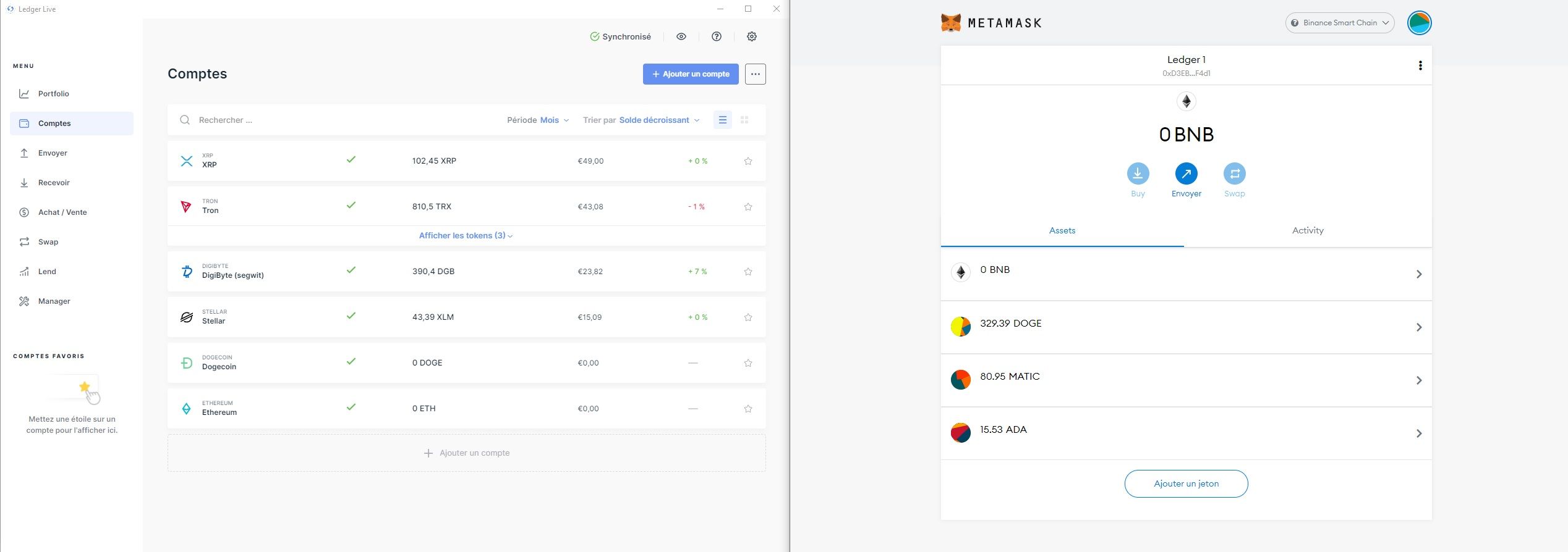J’ai des DOGECoin sur ma Ledger, ils sont visible depuis Metamask mais pas Ledger Est-ce normal ? De plus, je ne comprend pas comment transférer! les monnaies visibles depuis Metamask qui sont dans mon Ledger.